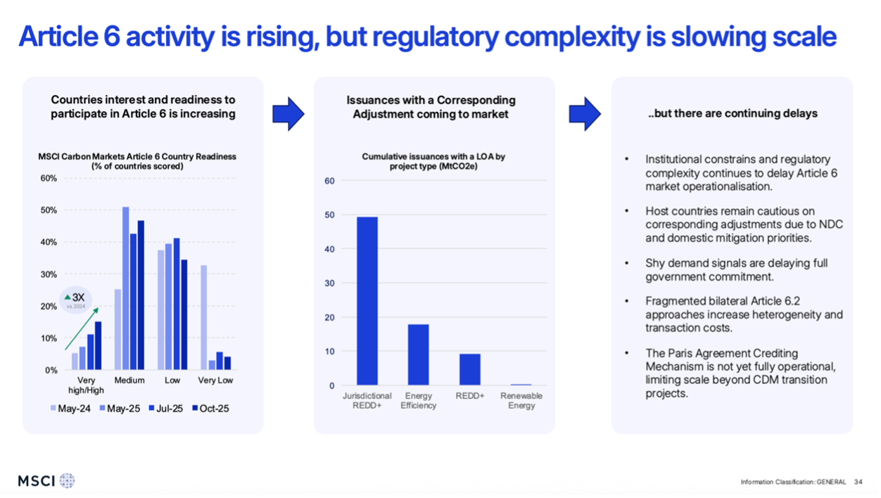 Compliance and Article 6: Around one-third of credit demand is now driven by compliance schemes (such as Colombia’s carbon tax). Countries’ readiness for Article 6 of the Paris Agreement tripled in 2025.